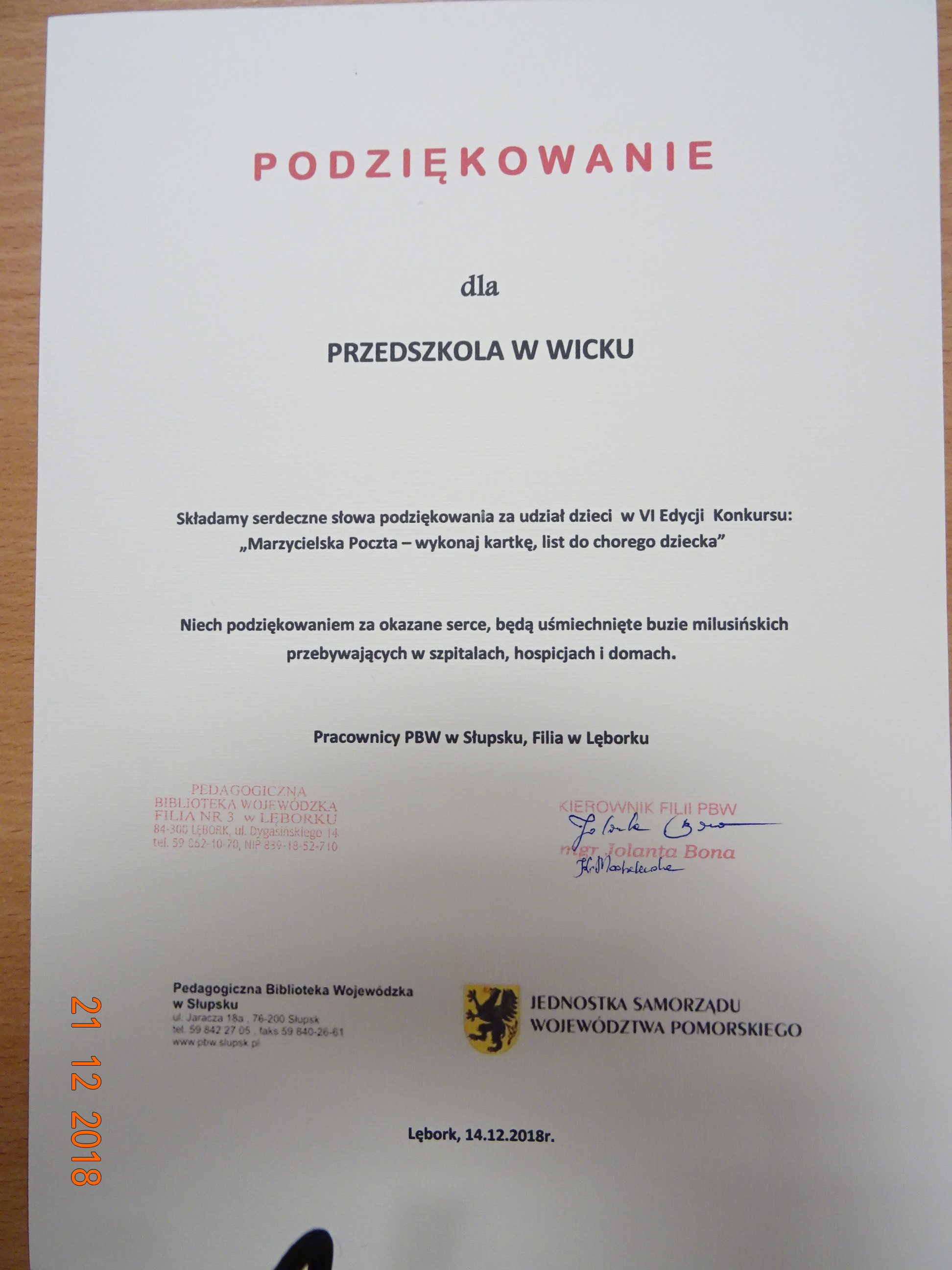 Kolejny raz z okazji zbliżających się Świąt Bożego Narodzenia nasze przedszkolaki przyłączyły się do VI Edycji Konkursu: „Marzycielska Poczta”- wykonaj kartkę, list do chorego dziecka”. Inicjatorem akcji była Pedagogiczna Biblioteka Wojewódzka w Słupsku z Filią w Lęborku. Przedszkolaki wraz z wychowawczyniami z dużym zaangażowaniem wykonały kartki świąteczne z życzeniami, chętnie rysowały, malowały farbami, wyklejały, wycinały. Starały się, aby kartki były kolorowe i tematycznie związane ze świętami. Adresatami kartek były chore dzieci przebywające w szpitalach, hospicjach i domach. Za udział w konkursie przedszkolaki i placówka otrzymali podziękowanie i Wielką Księgę Bajek do czytania. Pomaganie przynosi zawsze dużo radości.