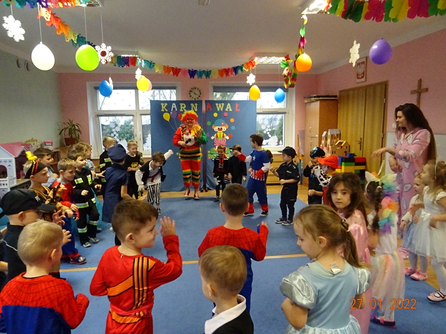 Karnawał to wspaniały okres zimowych balów, zabaw, a także nieodłączny element dzieciństwa. Jest on atrakcyjną i bardzo lubianą przez dzieci formą rozrywki, dostarcza im wielu przeżyć, radości i zadowolenia. W czwartek 27 stycznia dzieci z naszego przedszkola wzięły udział w Balu Karnawałowym „W bajkowej krainie”. Już od wejścia można było wyczuć niecodzienny nastrój. Po śniadaniu, zanim zaczęła się zabawa, przedszkolaki uczestniczyły w sesji zdjęciowej, pan fotograf wykonał pamiątkowe zdjęcia . I zaczął się bal….. Klaun Śmieszek zachęcał dzieci do tańca przy skocznej i rytmicznej muzyce. Tematem przewodnim był „W krainie bajek”. Przebierańcy świetnie się bawili uczestnicząc we wspólnych zabawach. Były więc zabawy z muzyką, konkursy, pląsy, w których wszyscy chętnie uczestniczyli i każdy otrzymał niespodziankę. Na sali było kolorowo, wszyscy bawili się wesoło, uśmiech nie znikał z twarzy mimo chwilowego zmęczenia. Najbardziej wyczekiwany był Św. Mikołaj, który zostawił dla dzieci paczki pod choinką. Wspólna zabawa przyniosła wiele radości naszym, to było głównym celem tego balu.