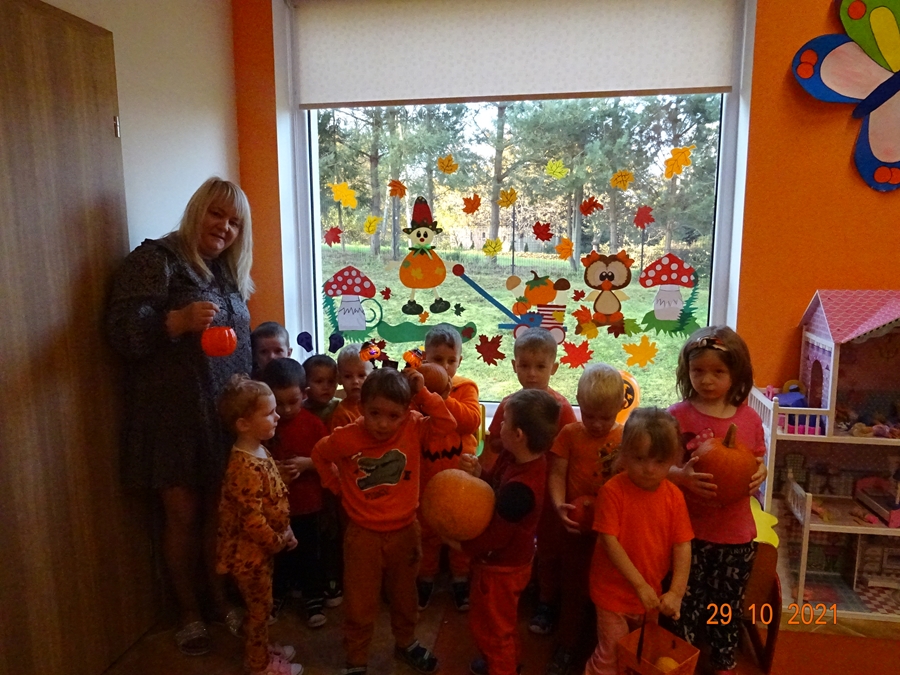 Nadchodzi koniec jesiennych zbiorów, więc to najlepszy czas by ogłosić „Dzień Dyni” . W naszym przedszkolu święto to obchodziliśmy w piątek 29 października. Dzieci ubrane na pomarańczowo, jesiennie i bajkowo poznały wielką różnorodność dyń i wzbogaciły wiedzę na ich temat. Dowiedziały się, że dynia jest bardzo zdrowym warzywem i, że można z niej przygotować wiele dań tj.: pieczywo, zupę, dżem, ciasto, babeczki, przetwory i soki. Dzieci miały okazję przekonać się jak smakuje zupa z dyni oraz babeczki, które przygotowały dla nas panie kucharki. Następnie przystąpiliśmy do dyniowych zabaw: klasyfikowania dyń wg wielkości, koloru i kształtu, szeregowanie od największej dyni do najmniejszej, przeliczania dyń i wiele innych. Przedszkolaki wykonały również prace plastyczne… powstały piękne prace.