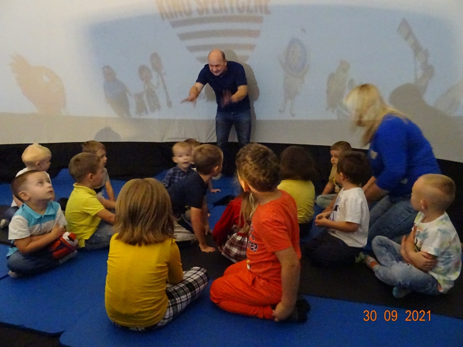 Młodsze dzieci 3-4-latki „Motylki”, w tym zjawiskowym kinie, obejrzały bajkę „Kosmiczna Przygoda Cocomong’a”,a „Rybki” 4-5-latki i „Sowy” 6-latki „Polaris. Tajemnica nocy polarnej „. W trakcie pokazu dzieci siedziały na miękkich dywanikach i podziwiały edukacyjne filmy sferyczne. To były niezapomniane wrażenia.