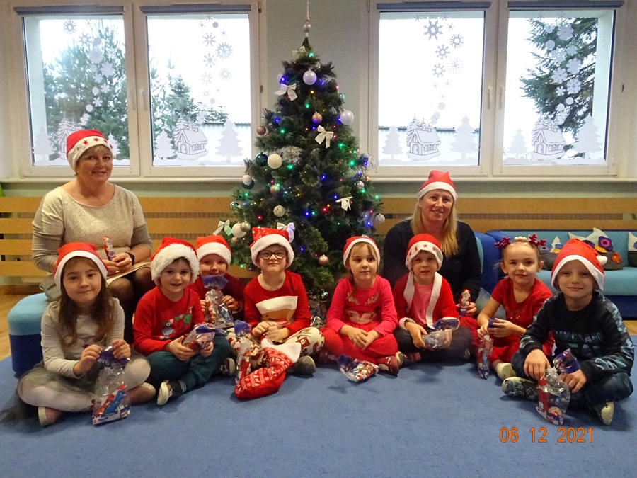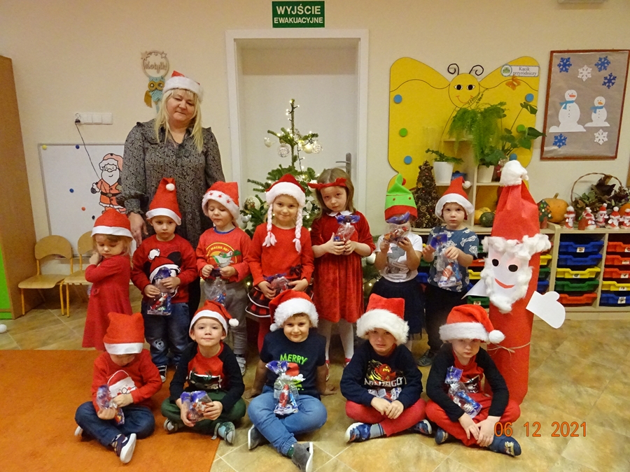 Mikołajki to dzień, na który dzieci czekają z niecierpliwością. Przedszkolaki starannie przygotowały się do wizyty św. Mikołaja w przedszkolu. Najpierw napisały, bądź narysowały list do Mikołaja prosząc go: „o małe co nieco…” oraz wykonały prace plastyczne specjalnie dla niego. W poniedziałek (06.12.2021 r.) nadszedł długo wyczekiwany przez dzieci dzień. W tym dniu wszystkie przedszkolaki ubrały się na czerwono, a na głowach nosiły mikołajkowe czapki lub świąteczne opaski. Niestety nie udało się spotkać Św. Mikołaja, jednak przedszkolaki nie były zawiedzione, ponieważ zostawił im prezenty po choinką oraz specjalny list skierowany do dzieci. Wyjaśnił im w nim, że bardzo mu się spieszy, ponieważ musi obdarować dzieci na całym świecie upominkami i nie może dłużej czekać. W liście prosił również, aby dzieci były grzeczne, wspólnie się bawiły. Dzieci z błyskiem w oku odbierały swoje upominki obiecując, że przez cały rok będą grzeczne. W ciągu dnia przedszkolaki w salach zmagały się ze świątecznymi zadaniami, bawiły się m. in. w zaprzęg Mikołaja, śpiewały piosenki o Mikołaju, uczestniczyły w zabawach ruchowych i muzycznych oraz poznały historię Mikołaja i obdarowywania się upominkami. Nie zabrakło prac plastycznych o Mikołaju. Szkoda ,że Mikołajki nie są codziennie!