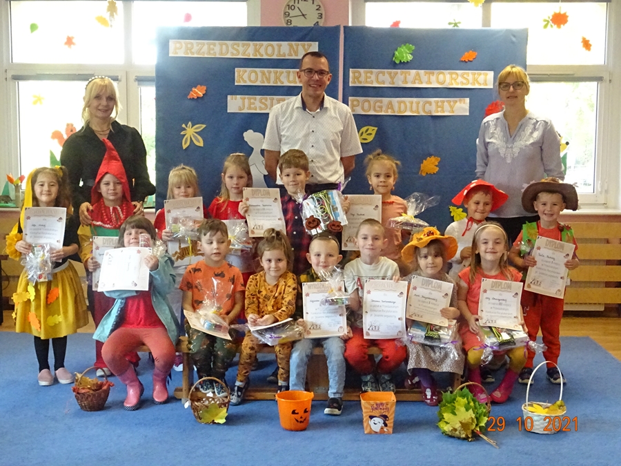 W piątek 29. 10. 2021 r. odbył się Przedszkolny Konkurs Recytatorski „Jesienne pogaduchy”. Do komisji konkursowej zaprosiliśmy Dyrektor Biblioteki Publicznej Gminy Wicko Panią Iwonę Szymichowską, Dyrektora Gminnego Ośrodka Kultury i Sportu Pana Rafała Skibińskiego oraz naszą Panią Intendent Dorotę Ostapko. Do konkursu zgłosiło się 20 dzieci, jednak z powodu choroby uczestników było mniej. Głównymi celami konkursu była popularyzacja literatury dziecięcej oraz rozwijanie predyspozycji i talentu recytatorskiego dzieci w wieku przedszkolnym. Gości, publiczność i jury przywitała Pani Basia po czym rozpoczęły się występy. Dzieci wspaniale zaprezentowały się w znanych i mniej znanych wierszach o tematyce jesiennej. Duże uznanie należy się mamie Wojtka, która sama napisała krótki wiersz specjalnie dla syna. Dziękujemy również wszystkim rodzicom uczestników za stroje i przygotowanie dzieci do zmagań konkursowych.