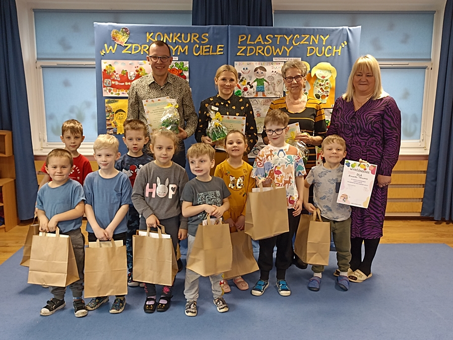 W dniu 20. 03. 2023 r. odbyło się rozstrzygnięcie przedszkolnego konkursu plastycznego pt. „W zdrowym ciele, zdrowy duch”, którego celem było promowanie wśród dzieci zasad zdrowego stylu życia. Każda praca odznaczała się ciekawą formą, techniką plastyczną oraz kreatywnością w rozwiązaniu tematu konkursowego. Konkurs był przeznaczony dla wszystkich dzieci z naszego przedszkola w 2 kategoriach wiekowych tj. dzieci trzyletnich i czteroletnich, pięcioletnich i sześcioletnich. Specjalnie powołana komisja: Dyrektor GOKiS w Wicku Pan Rafał Skibiński, Pani Krystyna Rajewicz i Terapeuta zajęciowy w Klubie Seniora w Wicku Pani Ewelina Okon wyłoniła laureatów. Przy ocenianiu prac brano pod uwagę przede wszystkim walory artystyczne prac, indywidualne podejście do tematu, oryginalność, uchwycenie najważniejszych cech zdrowego stylu życia oraz wkład pracy dziecka.