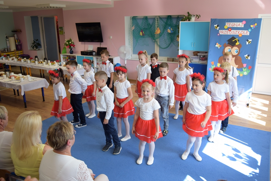 „ŻEGNAMY PRZEDSZKOLE”- hasło to, towarzyszyło wszystkim 6 – latkom, które po wakacjach rozpoczną naukę w szkole podstawowej, podczas uroczystego zakończenia roku przedszkolnego, które odbyło się 18.06.2019 r. o 16:00 w naszym przedszkolu. Rodzicom, pani dyrektor, nauczycielom i pracownikom przedszkola oraz zaproszonym gościom dzieci zatańczyły poloneza, przedstawiły program artystyczny, w którym prezentowały swoje nieprzeciętne zdolności artystyczne. Publiczność mogła podziwiać również taneczne talenty przedszkolaków. Następnie pani dyrektor wręczyła dzieciom pamiątkowe DYPLOMY UKOŃCZENIA PRZEDSZKOLA oraz upominki.